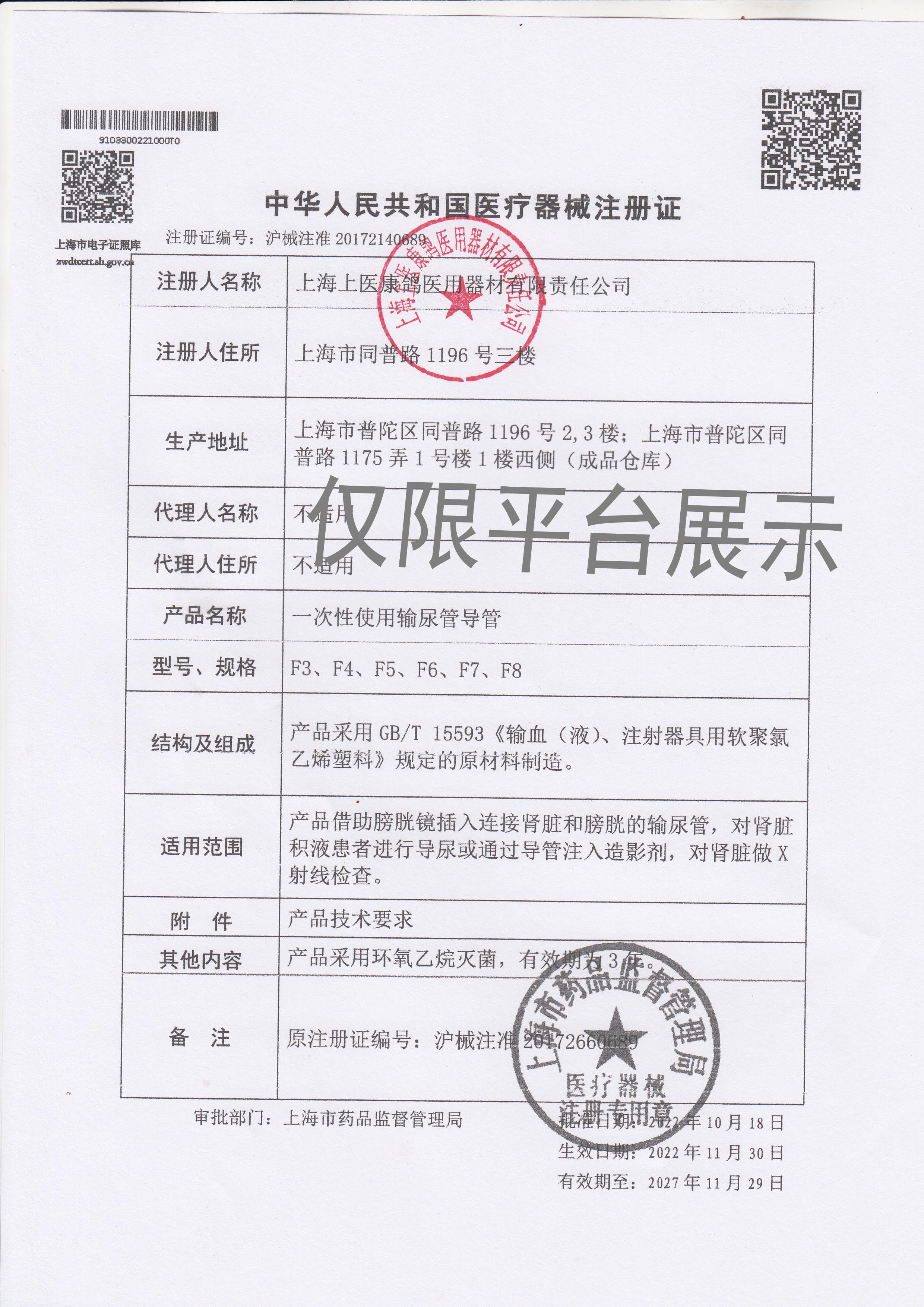 产品名称 : 上海康鸽输尿管导管(二支包装)