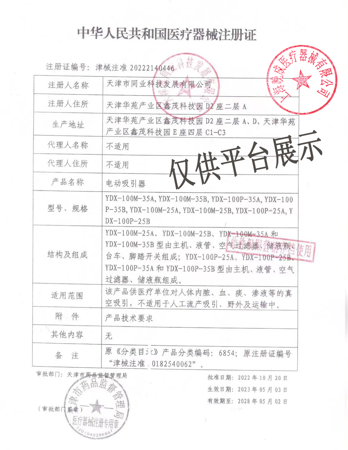 | 产品名称 : | 同业医用电动吸引器YDX-100P-25B |