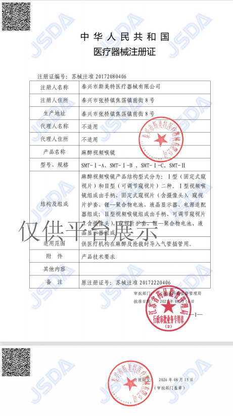 产品名称 : 斯美特便携式麻醉视频喉镜SMT-I-B