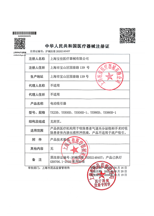 YX980D-1型电动吸引器是一种高负压、大流量的医用吸引装置。该产品适用于医疗机构吸出患者气道内分泌物,手术时吸除患者体内渗出液和冲洗液。不适用于流产吸引。注册证号:沪械注准20202140407